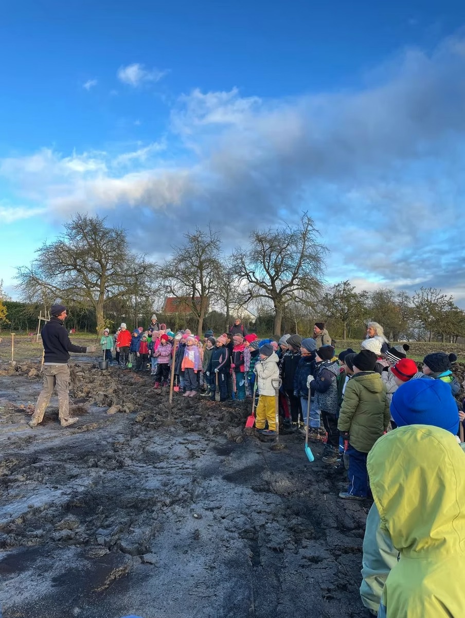 Am Morgen der Pflanzung mit der Breiteich Grundschule war die oberste Schicht des Bodens leicht angefroren, wodurch wir uns anfangs noch gut auf dem Feld bewegen konnten. Als es nach zwei Stunden zu tauen begann, wurde es immer rutschiger. Der Boden war so schwer, dass die Schüler nur mit großer Mühe Löcher für die Bäume ausheben konnten und fast bei jedem Schritt mit ihren Gummistiefeln im Schlamm stecken blieben. Trotzdem wurde mit viel Leidenschaft gepflanzt!